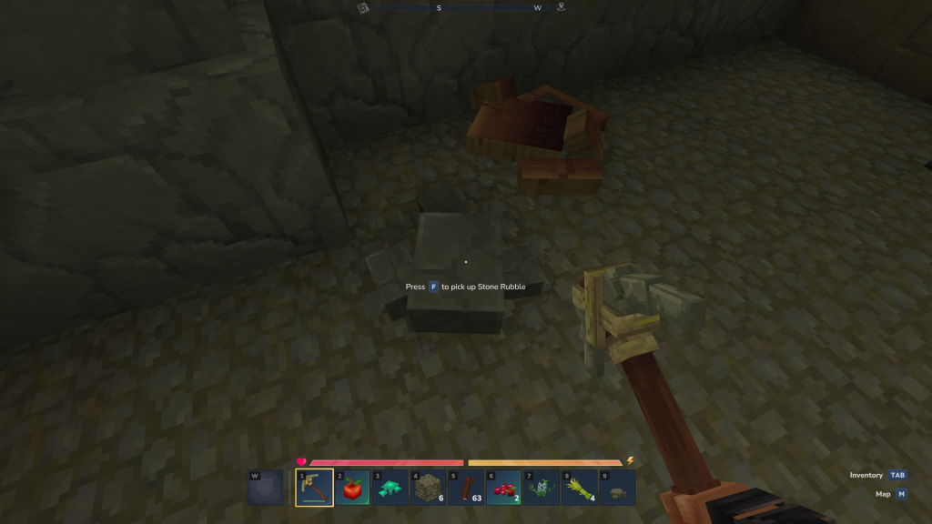 Ici, en ce qui concerne les débris (rubble), si vous ne savez pas de quoi il s’agit, c’est en réalité des petits tas de pierres que vous pourrez trouver un peu partout en vous baladant (nous sommes gentils, nous avons mis un screen pour vous aider à les repérer plus facilement).
