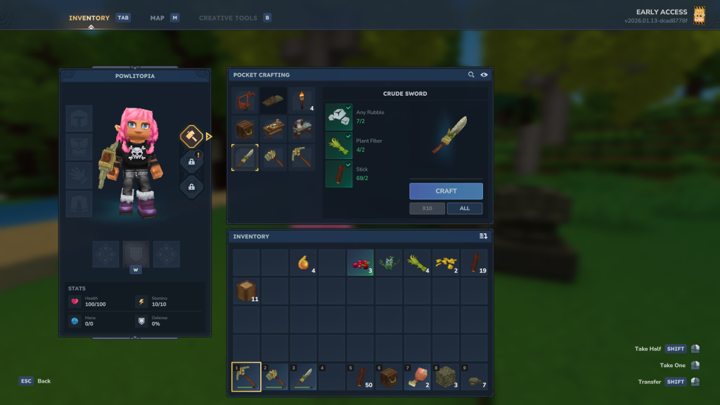 Une fois toutes les ressources en main nécessaires, vous n’avez plus qu’à ouvrir le menu de votre inventaire avec la touche « TAB », sélectionner l’icône de l’épée, puis la crafter.