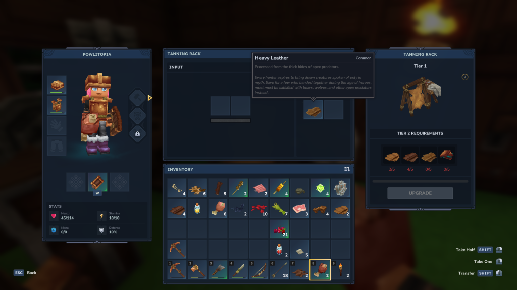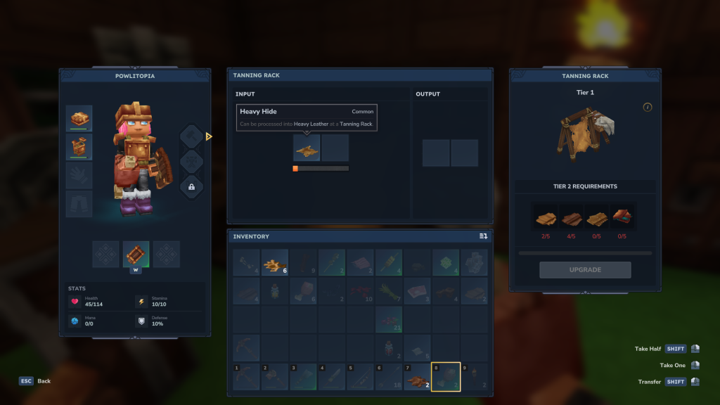 Une fois les morceaux de peau de bête en main, rendez-vous à votre étendoir, puis, insérez-les dans la case « Input » : vous n’avez rien d’autre à faire, vos morceaux vont se transformer directement en cuir épais/haut.