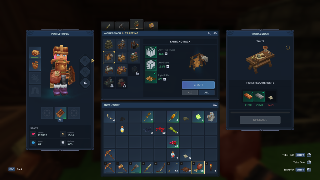 Pour ce faire, rendez-vous dans votre établi de base, puis sélectionnez l’onglet où se trouve le four : ici, vous verrez alors apparaître les différents ateliers dont l’étendoir, et pour le fabriquer, il vous faut : x6 troncs d’arbre, x3 pierres et x3 peaux légères.