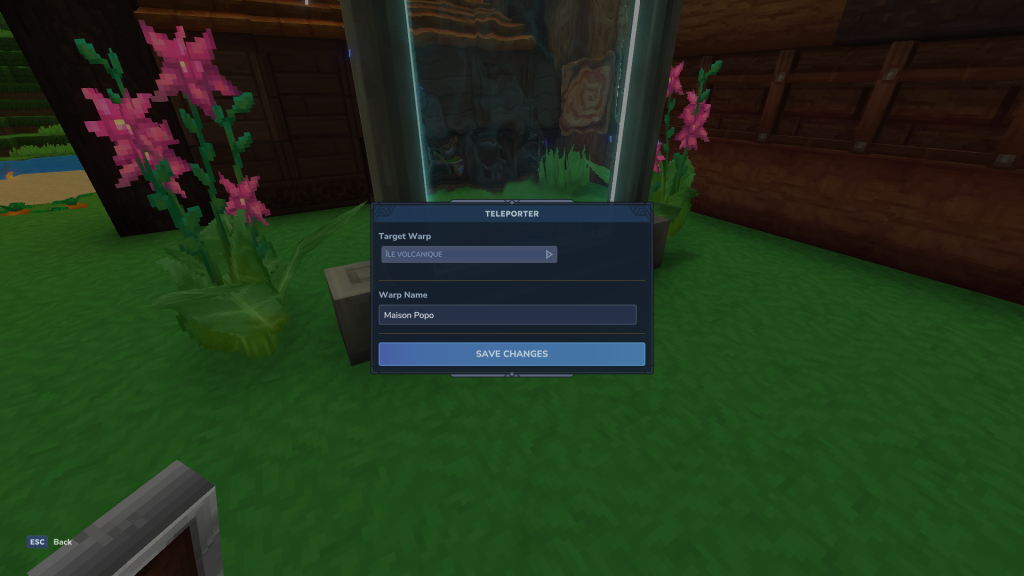 Maintenant que vous avez vos deux téléporteurs, vous allez devoir les placer et les configurer. Pour cela, placez le premier : personnellement, j’en ai mis un juste devant ma maison, et je l’ai simplement nommé « maison ». Lorsque vous l’aurez configuré, sauvegarder les changements, et ce dernier s’activera. Pour le second, je l’ai placé dans un endroit stratégique : une île volcanique.