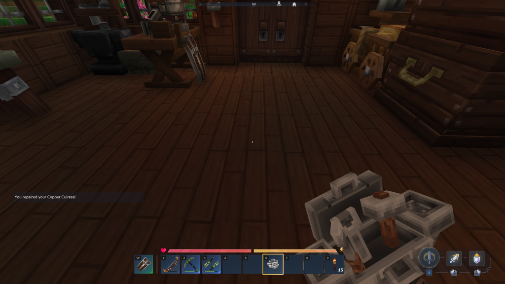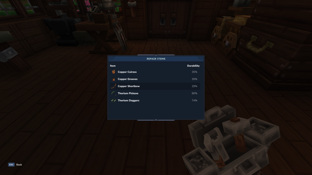 Maintenant que votre kit de réparation est prêt, glissez-le dans votre barre d’action, puis munissez-vous de celui-ci. Une fois en main, cliquez sur la touche droite de votre souris, et là, s’affichera alors une fenêtre dans laquelle vous verrez la liste de tout votre équipement (armure, armes et outils), avec le pourcentage de durabilité de chacun des éléments. Sélectionnez celui que vous voulez en validant alors avec le clic droit de votre souris, et voilà, vous avez réparé votre outil !