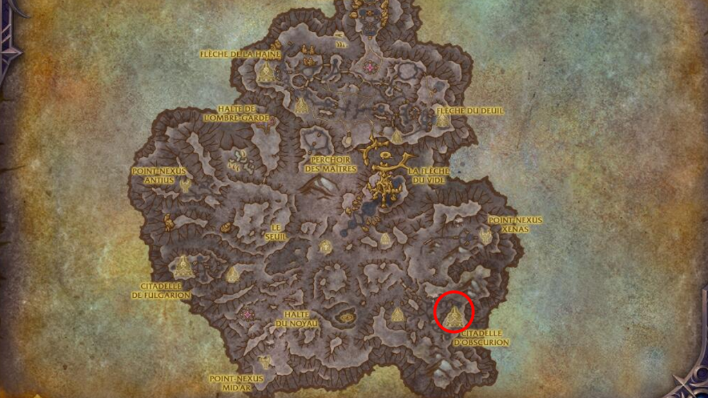 Le Sac sanglant n’est pas directement trouvable en jeu à l’origine. Pour mettre la main dessus, vous devez d’abord trouver l’Oubliette oubliée dans la Citadelle d’Obscurion, au Sud-Est de la zone de la Tempête du Vide, aux coordonnées 64.53, 75.47. L’entrée de la Citadelle d’Obscurion se trouve aux coordonnées 63.77, 75.76 ou aux coordonnées 64.10, 76.20.