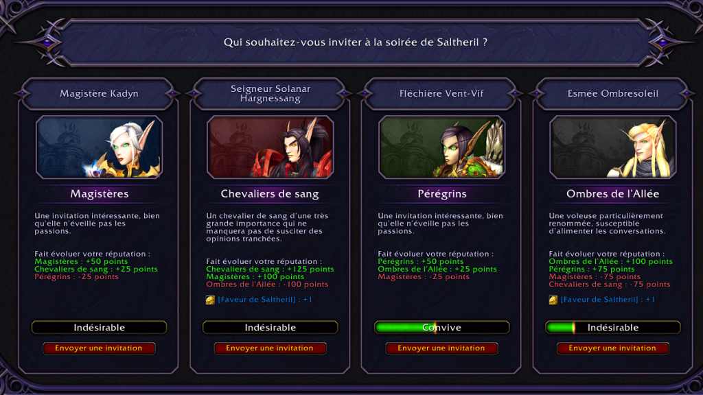 Vous avez également la possibilité d’offrir des Faveurs de Saltheril, obtenues en récompense de la quête « La faveur de la cour« , à n’importe lequel des convives afin d’obtenir une quêtes hebdomadaire octroyant de la réputation aurpès de la faction qu’il représente :