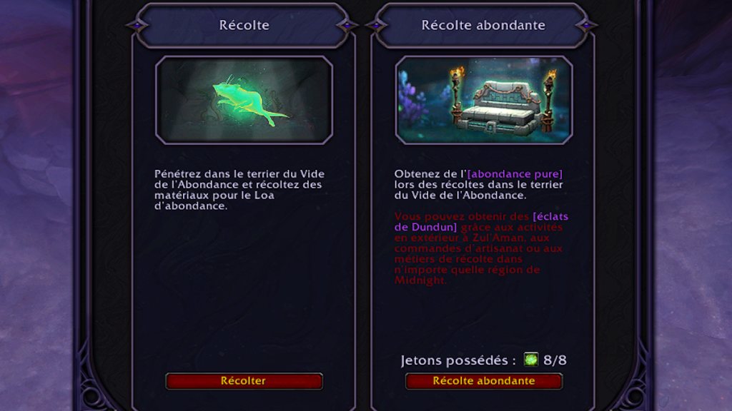 Rendez-vous ensuite auprès de Dundun, à l’entrée du Gouffre affecté par l’Abondance, pour choisir entre deux types de récoltes :
