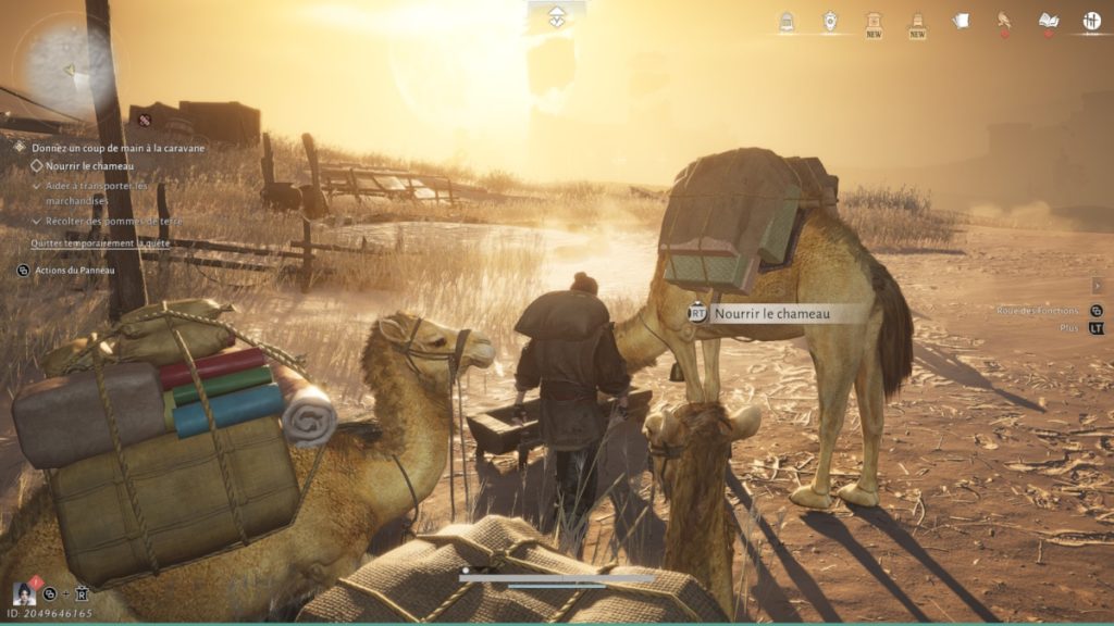 Après cette rencontre, vous accompagnez Hu jusqu’à Dacao, où une discussion s’engage entre plusieurs membres de la caravane. Peu importe les réponses choisies dans les dialogues : l’objectif est simplement de suivre la conversation et de s’asseoir sur le banc lorsque le jeu vous y invite. La suite consiste à aider les marchands à préparer le départ. On vous demande notamment de transporter une caisse de marchandises, de nourrir un chameau, récupérer des pommes de terre séchées, puis discuter avec Madame Qi. Une fois ces préparatifs terminés, rejoignez la foule près des chameaux pour assister à la scène annonçant le départ de la caravane.