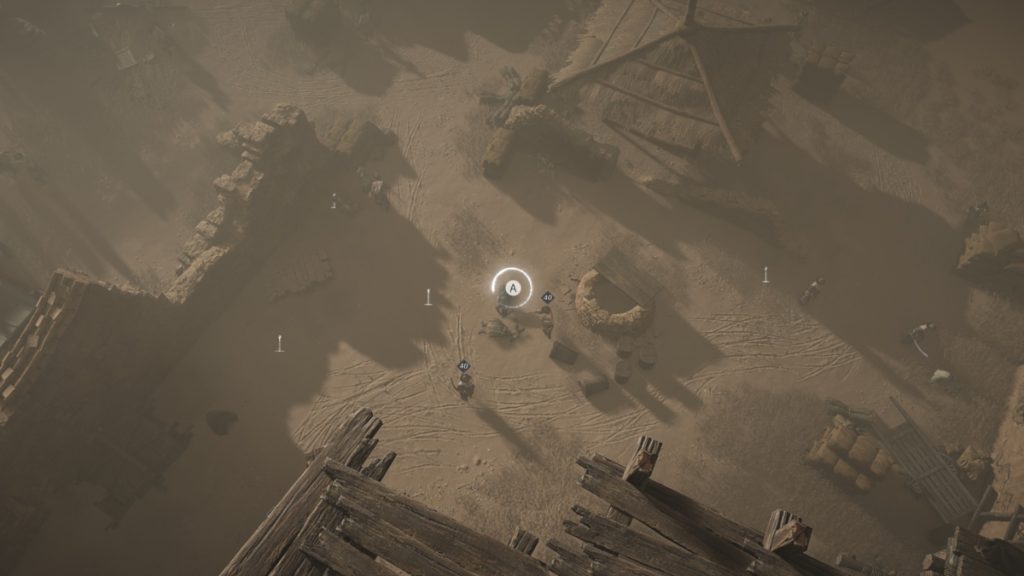 La poursuite qui s’ensuit vous mène à travers plusieurs zones remplies de débris. Cherchez un puits pour remplir à nouveau votre gourde, puis suivez le marqueur de quête afin de retrouver la trace de l’animal. La chasse se poursuit jusqu’à la tombée de la nuit, moment où l’histoire bascule vers une séquence de survie : un vautour monstrueux surgit et vous force à fuir vers le Fort du Phare.