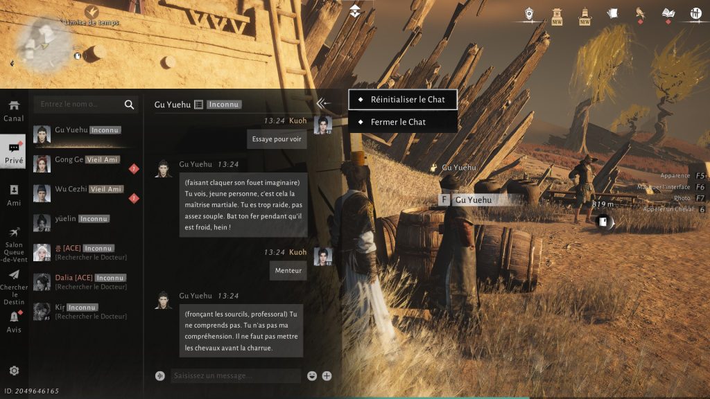• Quitter si un combat éclate : Certains dialogues peuvent brusquement dégénérer, au point où le PNJ se met à vous attaquer. Dans ce cas, quittez simplement vers l’écran de connexion : en revenant, la situation sera entièrement réinitialisée, sans conséquence durable. Et tant que possible, évitez de frapper le PNJ : même s’il finit par réapparaître, rien ne garantit que chaque cas fonctionne parfaitement.