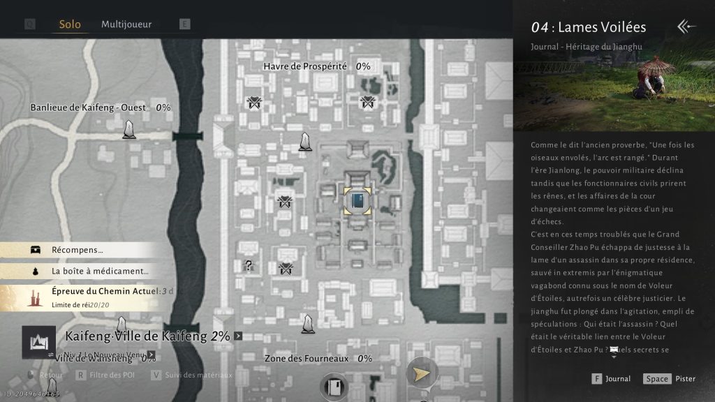 Pour lancer Lames voilées, il faut d’abord interagir avec le Voyageur à l’entrée de la ville de Kaifeng, pour débloquer la carte de la zone, puis suivre la quête depuis l’onglet Exploration. Une fois activée, dirigez-vous vers la rue Goldwater.