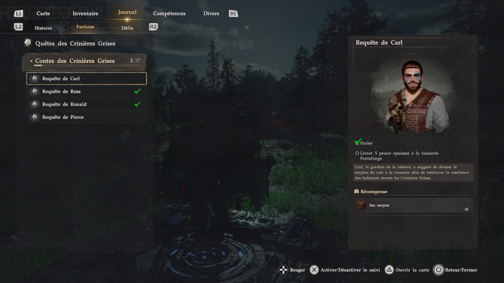 De plus, il y a pas mal de quêtes secondaires qui vous permettent d’en gagner. Pour savoir lesquelles, rendez-vous dans le menu du jeu, puis « Journal » et enfin « Factions ». Ici, vous y trouverez toutes les quêtes secondaires à faire, avec alors, les récompenses.