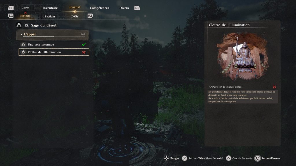 Ici, vous y trouverez les quêtes en cours, dont celles de l’histoire. Et pour savoir où vous devez aller, vous avez juste à sélectionner ladite mission puis appuyer sur « suivre » : vous aurez l’emplacement d’indiqué sur votre carte.