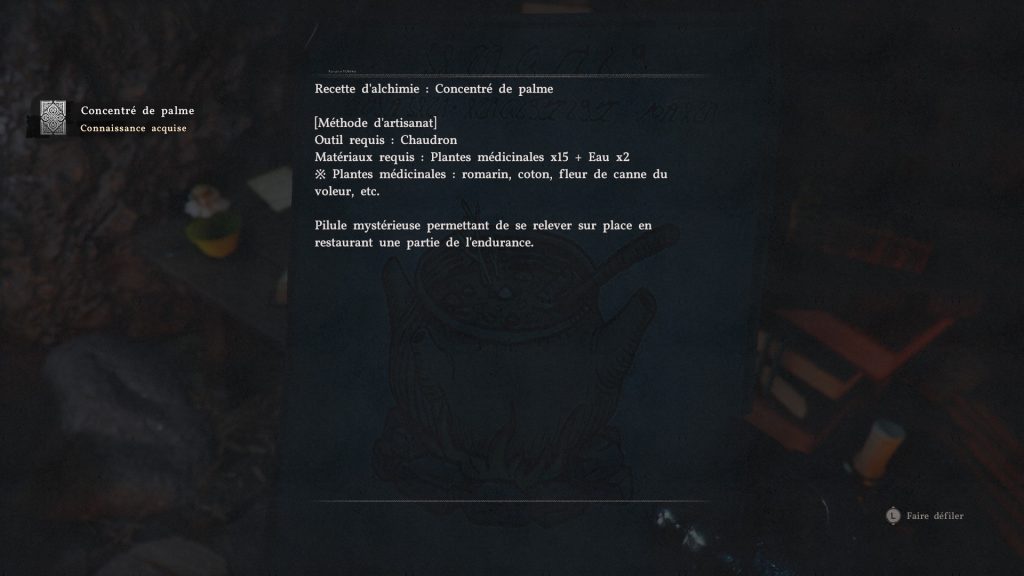 Afin de fabriquer du concentré de palme, vous allez devoir avant cela mettre la main sur la recette. Pour ce faire, rendez-vous dans une grotte, non loin de Hernand : elle se trouve un peu plus au nord, vers l’ouest. À l’intérieur, vous ferez la rencontre de Sylvia, une sorcière, et sur sa gauche, se trouve une table sur laquelle il y a la recette (et deux concentrés en bonus).