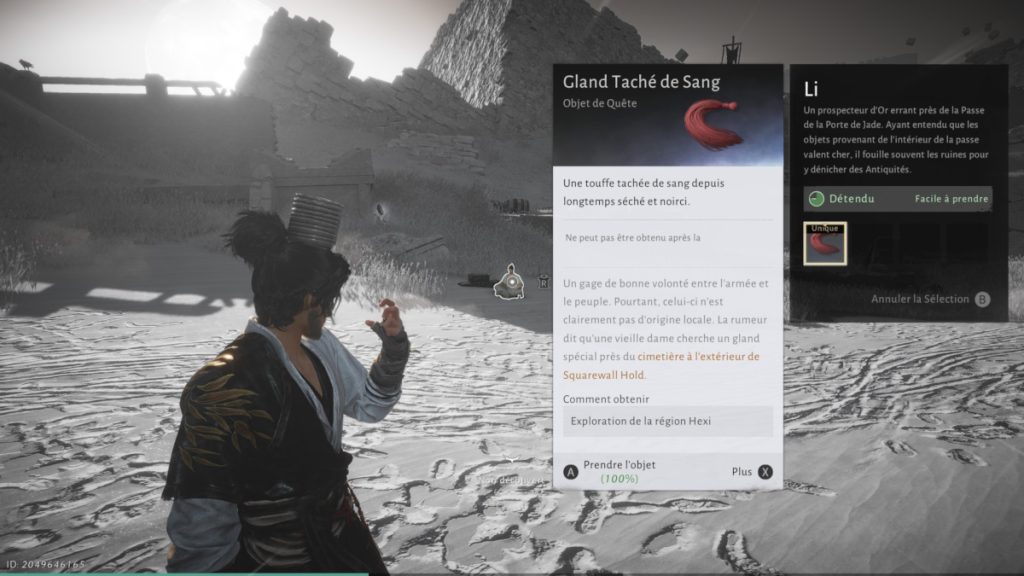 Sur place, Li évoque une relique qu’il refuse de céder. Impossible de progresser par le dialogue : il faut utiliser la compétence Arrachement céleste pour lui subtiliser discrètement l’objet, en se plaçant hors de son champ de vision.