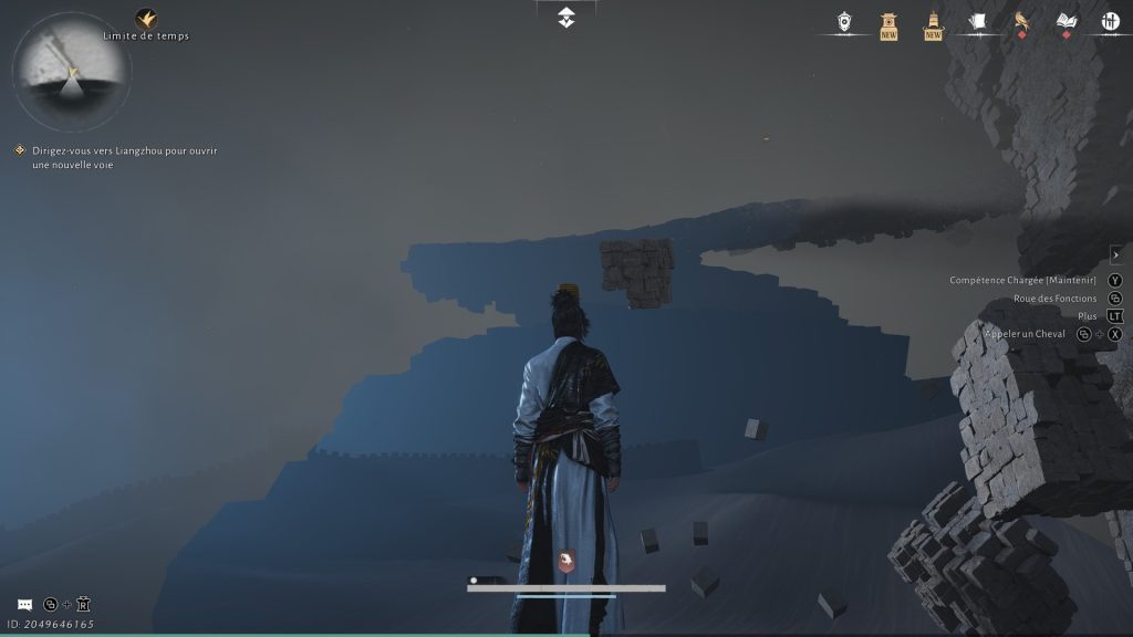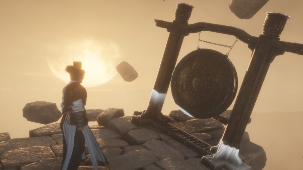 Grimpez ensuite jusqu’au sommet des ruines flottantes grâce à la compétence Pas des Nuage. Le chemin invisible n’apparaît que lorsque le vent souffle le sable, obligeant à avancer avec patience. Une fois le gong frappé, une nouvelle cinématique restaure complètement la Forteresse, et vous avez à présent accès à la Rencontre Fièvre Féline.