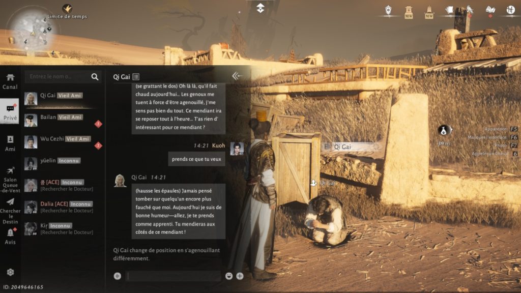 - Quitter si un combat éclate : Certains dialogues peuvent brusquement dégénérer, au point où le PNJ se met à vous attaquer. Dans ce cas, quittez simplement vers l’écran de connexion : en revenant, la situation sera entièrement réinitialisée, sans conséquence durable. Et tant que possible, évitez de frapper le PNJ : même s’il finit par réapparaître, rien ne garantit que chaque cas fonctionne parfaitement.