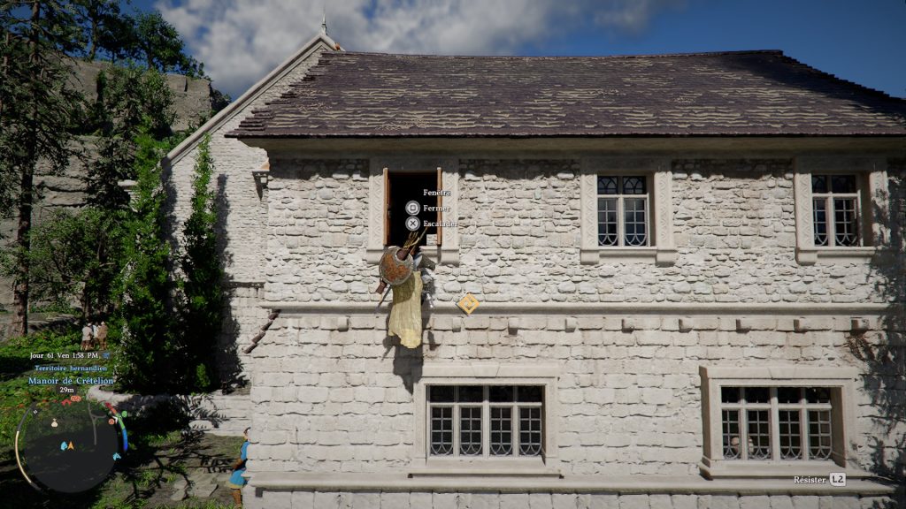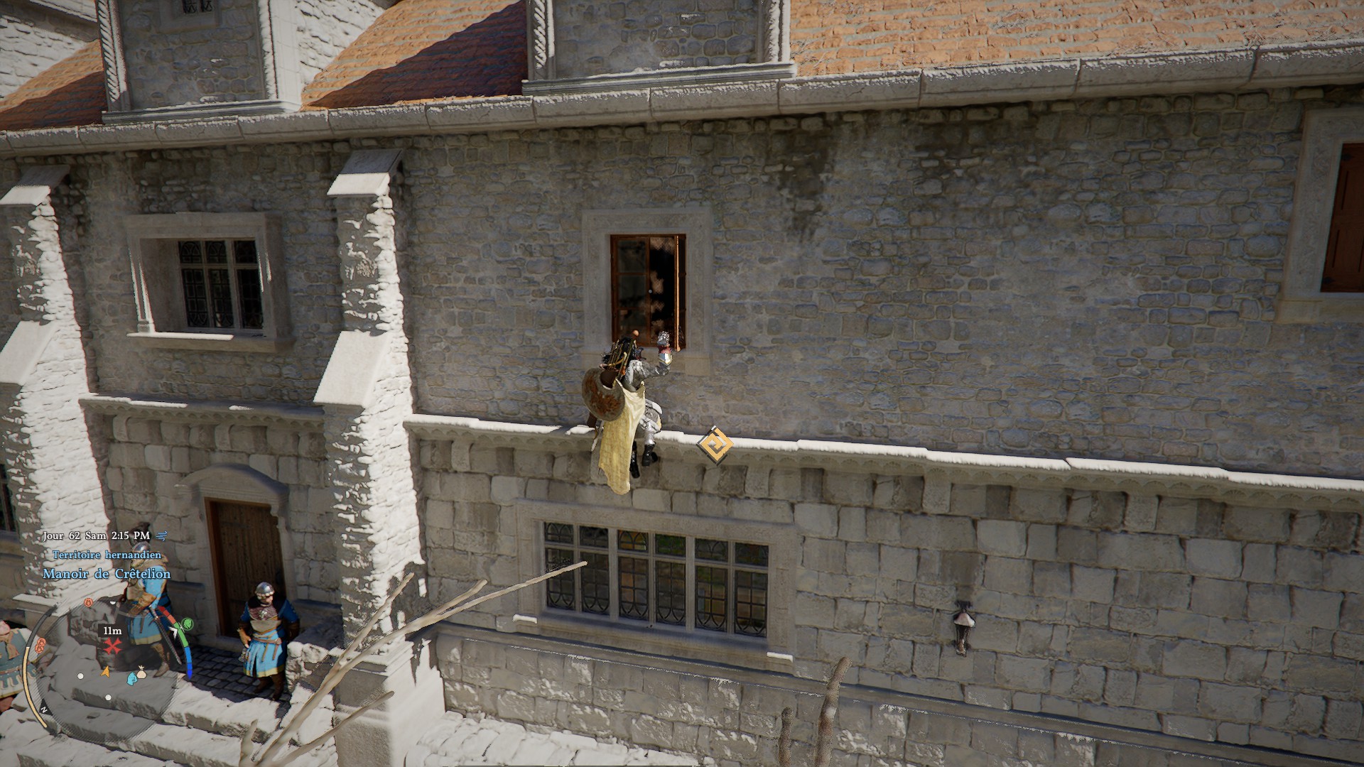 Avant toute chose, vous allez devoir vous équiper de votre masque de bandit, puis, direction le manoir qui, on le rappelle, se trouve au nord de la ville d’Hernand, à l’ouest. Pour entrer dans ce dernier, vous allez devoir passer par une fenêtre, et malgré les gardes, ne vous inquiétez pas, vous allez pouvoir escalader et l’ouvrir très facilement. Ici, nous sommes passer par l’une des fenêtres qui se trouve au niveau de la porte d’entrée.