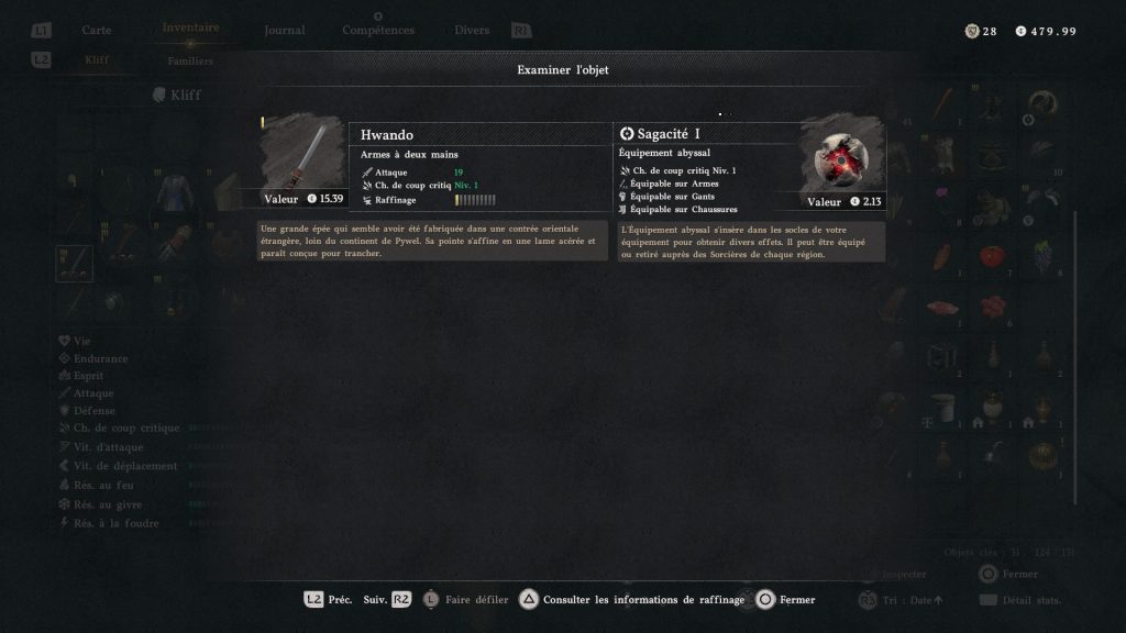 Il s’agit du katana Hwando, et celui-ci propose de très bonnes statistiques pour un début de jeu : en effet, il a 19 d’attaque ainsi que Sagacité 1.