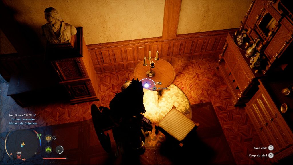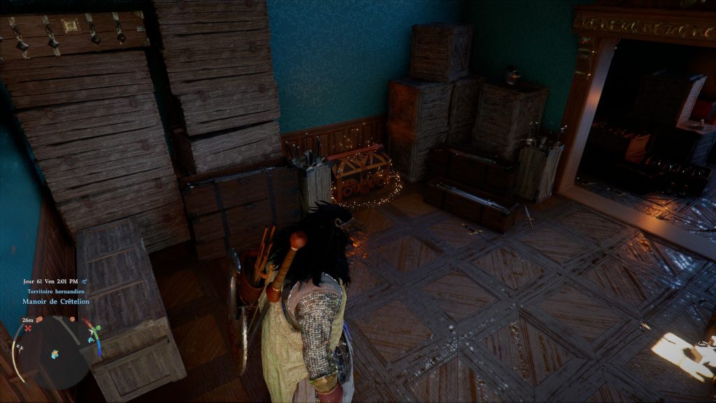 Maintenant, vous allez devoir vous diriger dans la dépendance qui se situe à gauche du manoir lorsque vous êtes en face de la demeure. Ici, vous allez une fois de plus devoir escalader puis ouvrir une fenêtre pour enfin, pénétrer dedans. Toujours à l’étage, vous verrez qu’il y a une pièce avec une porte verrouillée : utilisez votre clé pour entrer dans la salle, et vous y trouverez le katana qui est dans un énorme coffre.