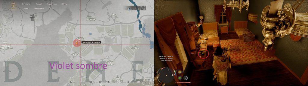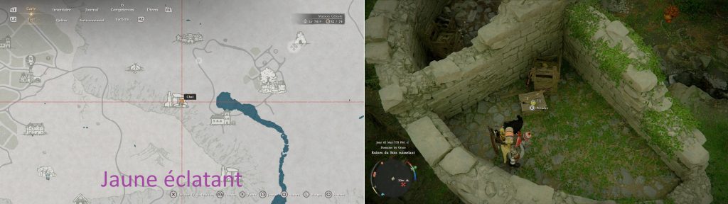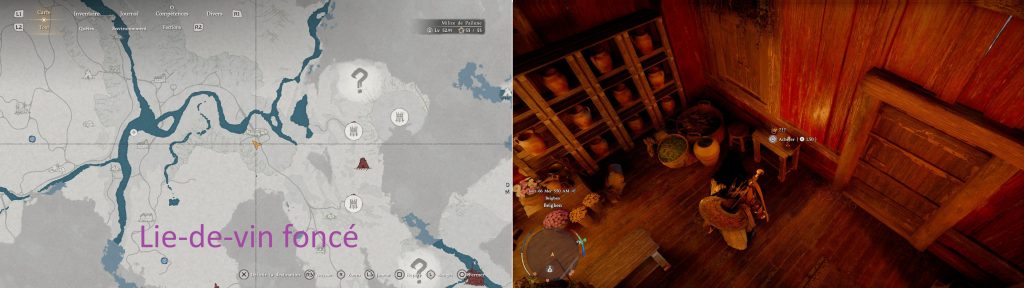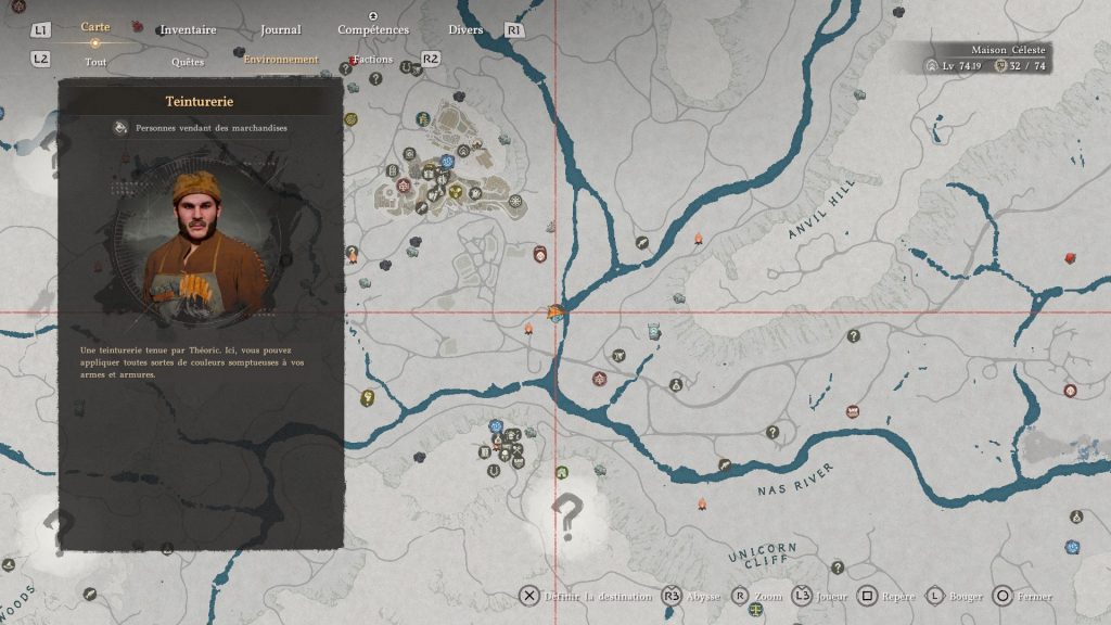 Pour celles et ceux que ça intéresse, vous pouvez acheter la teinture jaune dans la grotte qui se trouve un peu plus au nord d’Hernand (chez la sorcière Sylvia), trouver la teinture indigo près de Pororin (voir map), le jaune éclatant aux ruines (près de Pororin), le violet sombre dans une demeure près de Demeniss (attention il y a un boss), le lie-de-vin dans un manoir à Pailune au premier étage, lie-de-vin foncé à l’étage d’une boutique au village de Beighen, bleu-sarcelle-sombre (toujours dans Pailune)…