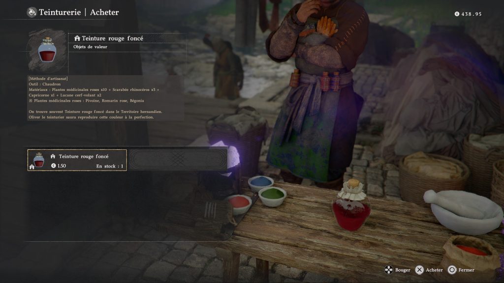 Chez lui, vous pouvez acheter la teinte rouge foncée, puis après cela, vous allez pouvoir apprendre sa recette (x10 plantes médicinales roses + x3 scarabées rhinocéros + x1 capricorne + x2 lucanes cerf-volant) et surtout, personnaliser vos différentes pièces d’équipement.