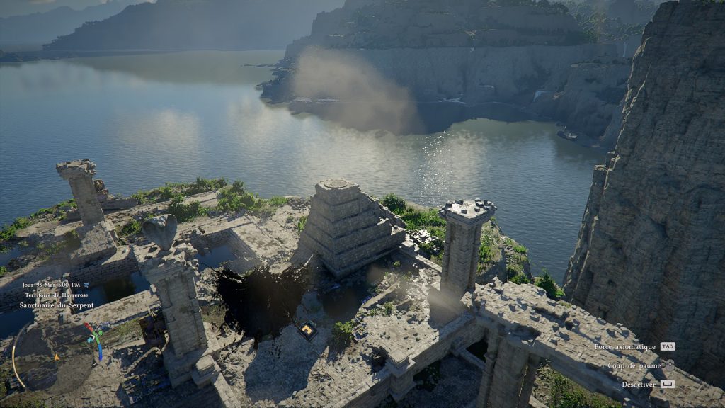 Lorsque vous arriverez sur place, vous verrez que pas mal d’ennemis tirent sur la pauvre bête, et votre première tâche va être de « rejoindre l’autel dans le sanctuaire ». Ici, rien de bien compliqué, il vous suffit simplement de grimper sur l’autel qui se trouve à droite, et attendre qu’Aeserion ait terminé son dialogue.