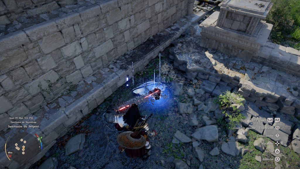 Maintenant, vous allez devoir affronter Priscus. Comme nous l’avons dit, équipez-vous de votre épée avec Orbe d’Ator et Poursuite du corbeau, puis donnez des coups pour le stun : une fois fait, frappez-le comme vous le pouvez. Aussi, vous pouvez également lui infliger des dégâts avec « voile du vent » et R3/Joystick droit.