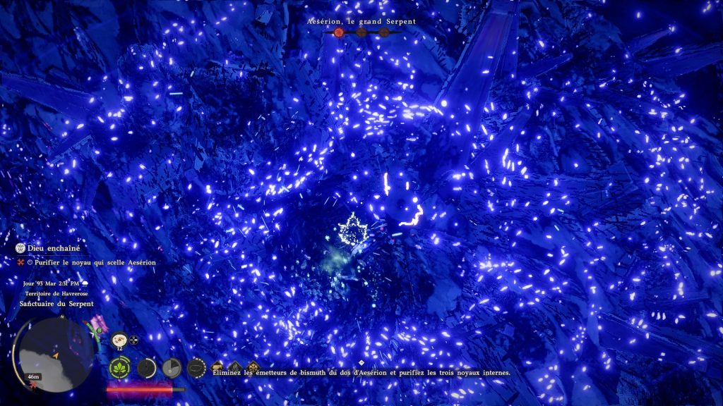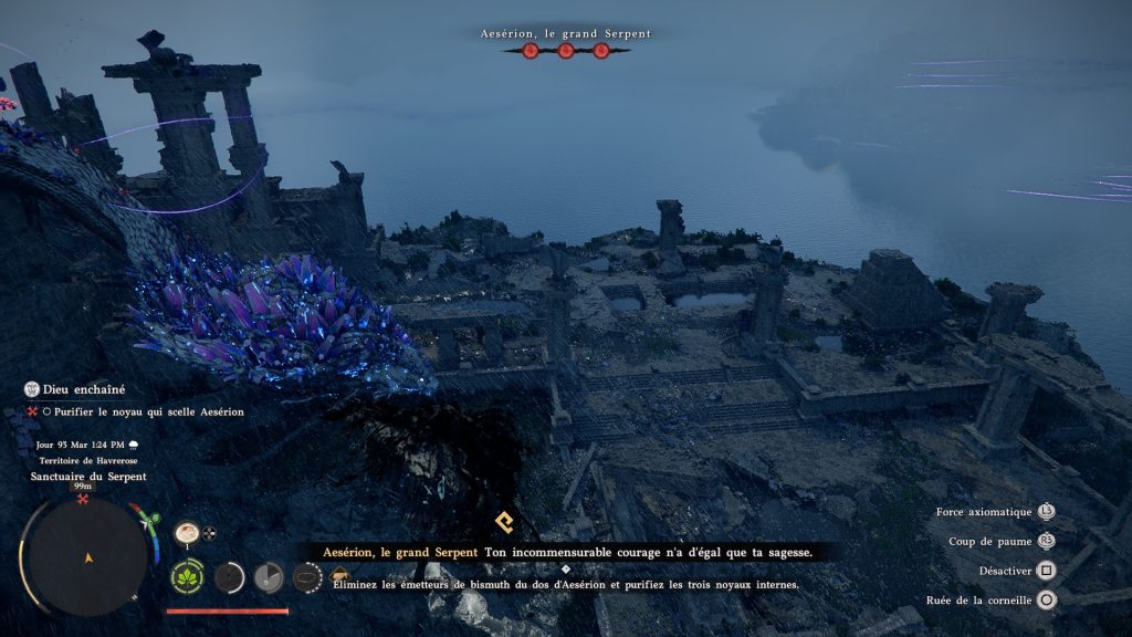 Maintenant, la dernière étape est de détruire et de purifier les trois noyaux internes qui se trouvent sur le dos d’Aeserion. Si c’est certainement la phase la plus simple, faites tout de même attention à tous les ennemis qui tirent sur la pauvre bête. De plus, le serpent balance des décharges qui peuvent vous donner des dégâts.
