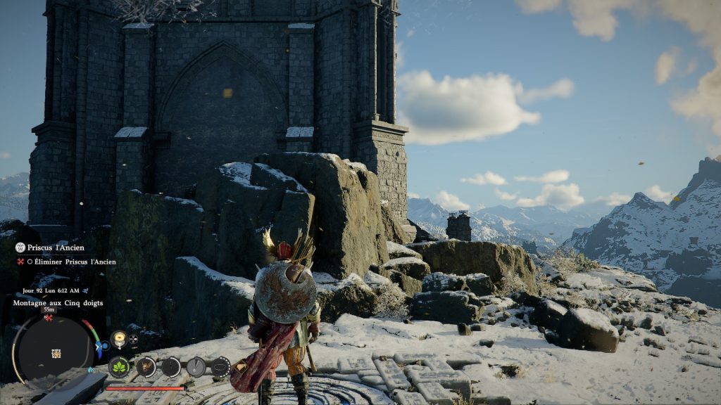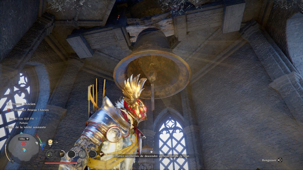 Ici, Priscus se trouve à l’ouest de Pailune, dans une énorme tour, et avant de le confronter, vous allez devoir résoudre une énigme, car ce dernier ne se trouve pas au sommet de celle-ci mais bien dans le souterrain. Pour y accéder, vous allez devoir grimper tout en haut de la tour : pour cela, utiliser le double saut + la force de la paume, ça va plus vite. Une fois au sommet, vous verrez alors qu’il y a une énorme cloche qui est attachée à des morceaux de bois : ces derniers sont fragiles ! Tirez une flèche dans ces derniers pour que la cloche se détache et creuse alors un énorme trou à la base de la tour. Dirigez-vous dans ce trou.