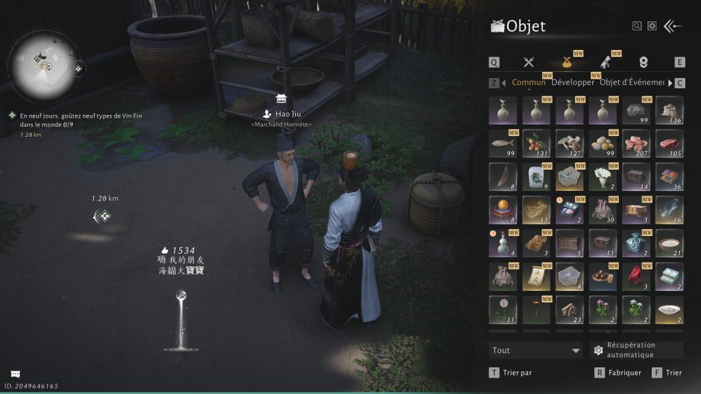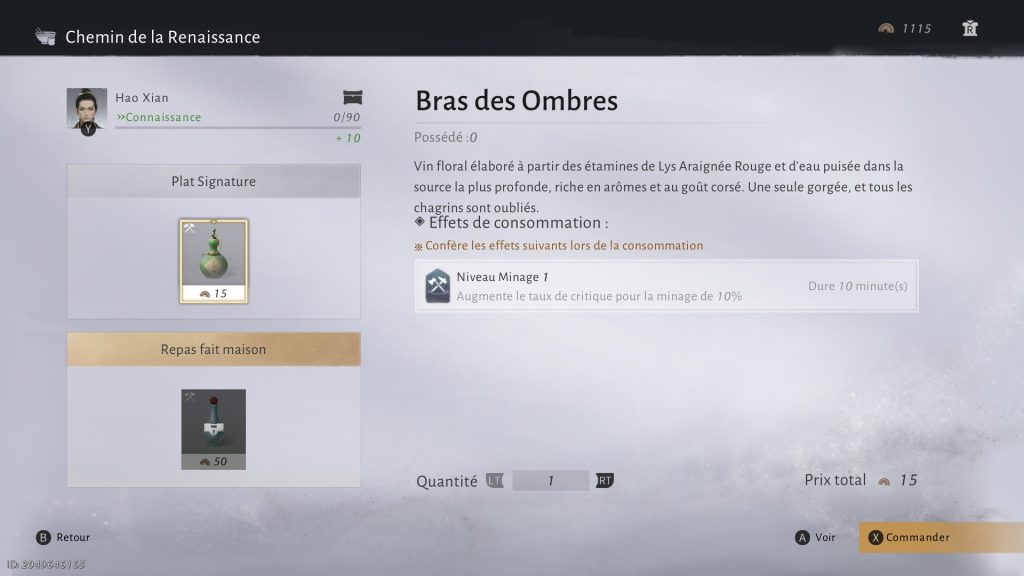 Rendez-vous ensuite au Marchés des Lueurs Fantômes à Kaifeng pour acheter les deux vins restants : le Bras des Ombres et le Vin du monde souterrain. Attention cependant, le second vous demandera d’avoir développé une relation minimale avec le marchand Hao Xian. Achetez-lui plusieurs exemplaires du premier vin pour augmenter votre amitié.