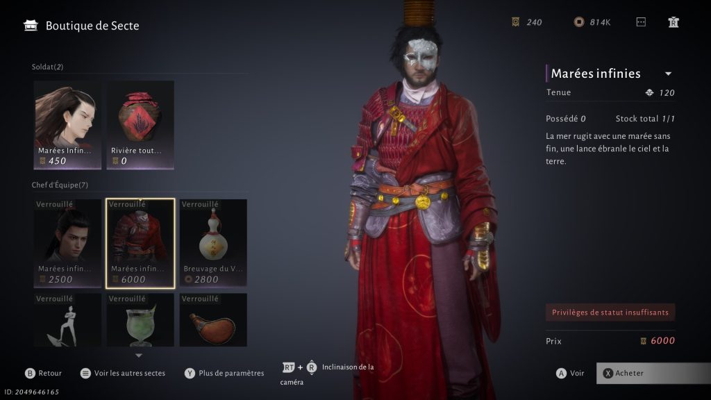 Cette progression débloque également l’accès à une boutique dédiée. On y trouve des objets cosmétiques exclusifs, des consommables rares et des récompenses liées à la réputation. Les objets cosmétiques restent en votre possession même si vous quittez la secte.