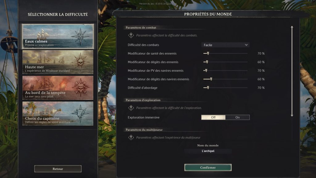 Par la suite, vous allez voir apparaître plusieurs paramètres à configurer comme la difficulté du serveur (eaux calmes, haute mer, au bord de la tempête, ou bien encore, choix du capitaine), la santé des ennemis, les dégâts des ennemis, les points de vie des navires adverses ou bien encore, la difficulté de l’abordage.