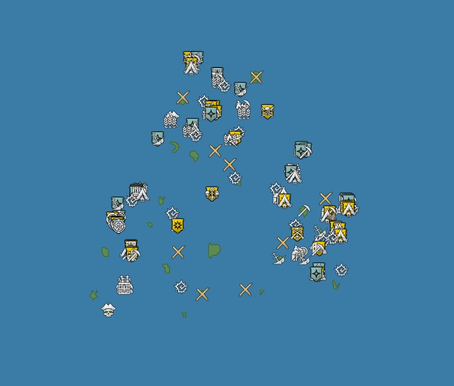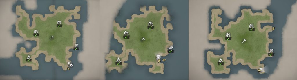 Comme nous le disions, aucune carte ne se ressemble à travers Windrose, néanmoins, vous devez savoir que l’île de départ, bien que sa forme diffère un peu d’un joueur à un autre, propose les mêmes points d’intérêt, aux mêmes endroits. Pour exemple, voici un screen avec trois parties différentes :