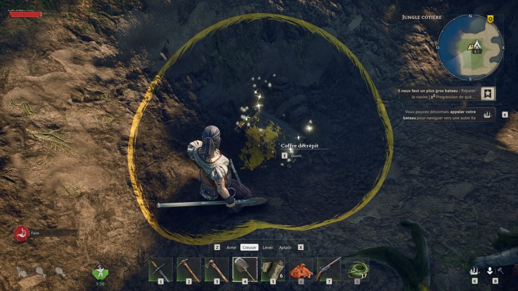 Pour ce faire, vous allez avoir besoin d’une pelle, et vous pouvez en crafter une auprès de votre établi, et pour ce faire, vous avez besoin de 3 lingots de cuivre, et 10 morceaux de bois. Une fois votre pelle en main creusez tout autour de l’arbre en question, et à un moment donné, vous allez voir que des petites étoiles jaillissent du sol : c’est là que se trouve le coffre. Vous n’avez plus qu’à creuser jusqu’à le voir entièrement, puis l’ouvrir et découvrir ce qu’il y a à l’intérieur.