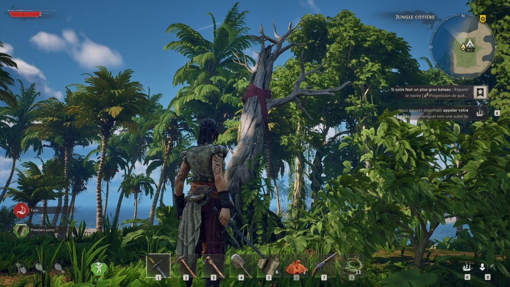Eh bien pour mettre la main sur le second coffre, vous allez devoir repérer un arbre sur lequel se trouve un énorme tissu rouge qui l’entoure : cela signifie qu’un coffre se trouve non loin sous terre, et vous allez donc devoir creuser.