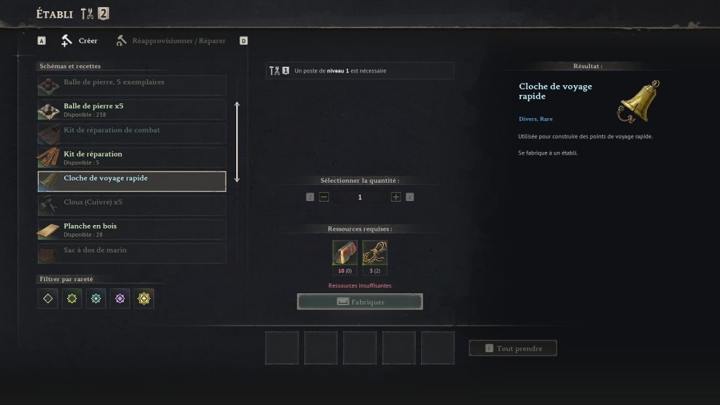Pour fabriquer une cloche, vous allez devoir vous rendre à votre fourneau de fonderie afin de fabriquer 10 lingots de cuivre. Par la suite, rendez-vous à votre établi pour fabriquer pas moins de 3 cordes. Enfin, toujours à votre établi, vous pouvez maintenant crafter votre cloche de voyage rapide.