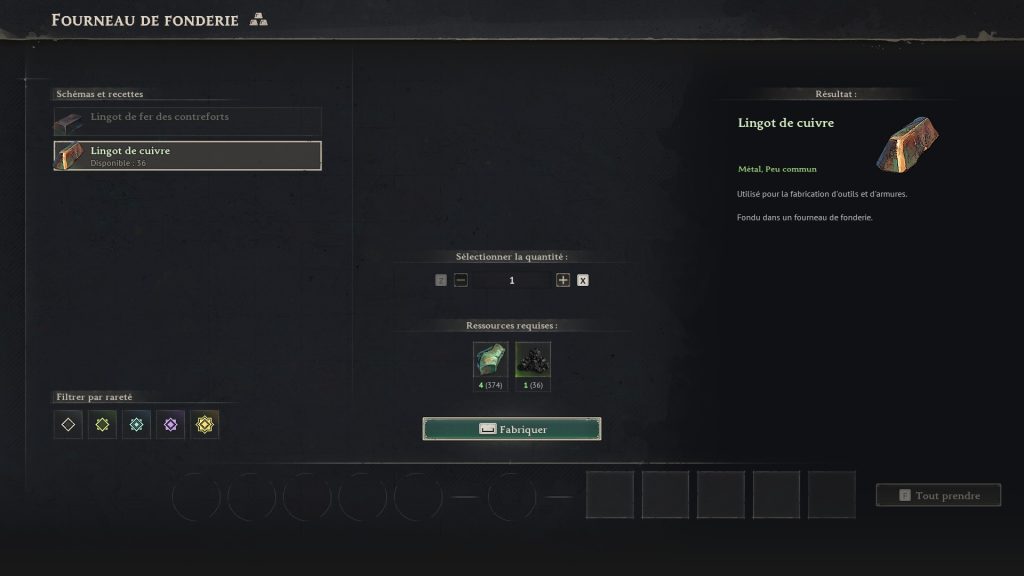 Une fois les lingots de cuivre fabriqués, vous débloquerez de nouveaux éléments et vous pourrez améliorer vos armes mais aussi votre stuff.