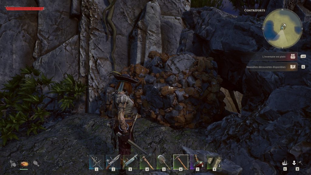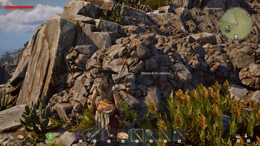 Une fois sur l’une de ces îles contreforts, s’il y a bien quelques grottes de fer qui sont marquées par le logo de la pioche, en réalité, vous allez pouvoir en trouver un peu partout, notamment dans les campements de pirates, ou bien sur des gros rochers.