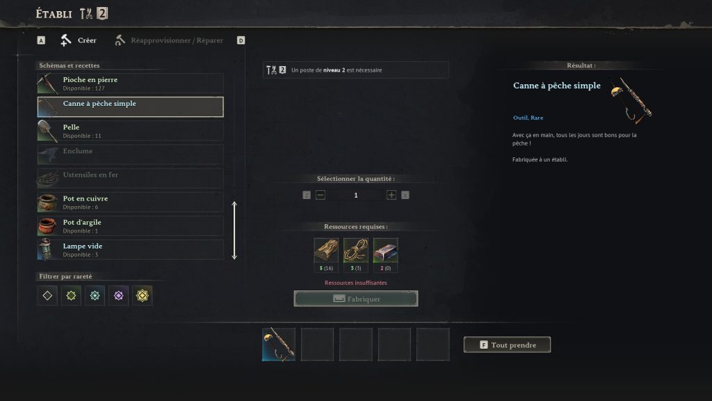 Pour la crafter, rendez-vous à votre établi. Attention, ici il doit être au niveau 2 (vous retrouverez tous les détails dans notre guide spécial établis et ateliers). Pour fabriquer une canne à pêche, vous aurez besoin de x5 bois durs, x3 cordes et x2 lingots de fer.