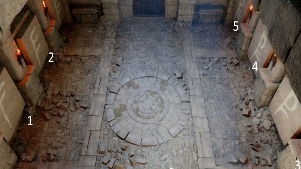 Après avoir franchi les pièges, vous accédez à une vaste salle dominée par un mécanisme central : une série de dalles gravées. L’objectif est simple, il faut activer les bonnes plaques.
