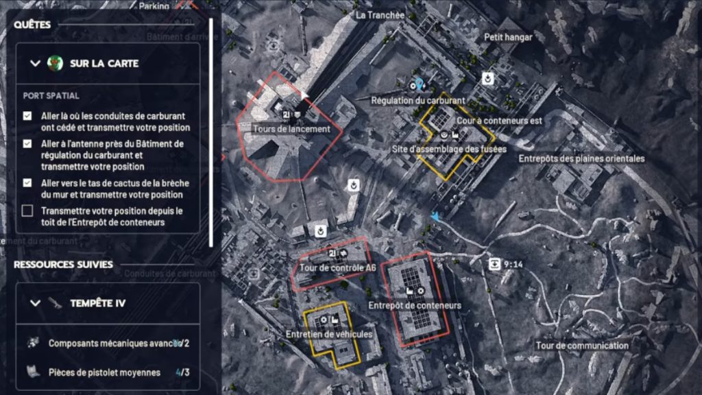 Le premier objectif se situe au sud-ouest, dans le fameux enchevêtrement de conduites de carburant endommagées. Inutile de chercher un terminal ou un objet spécifique. Il suffit de vous positionner correctement au milieu des structures pour lancer la triangulation. Le terrain est ouvert, donc restez mobile.