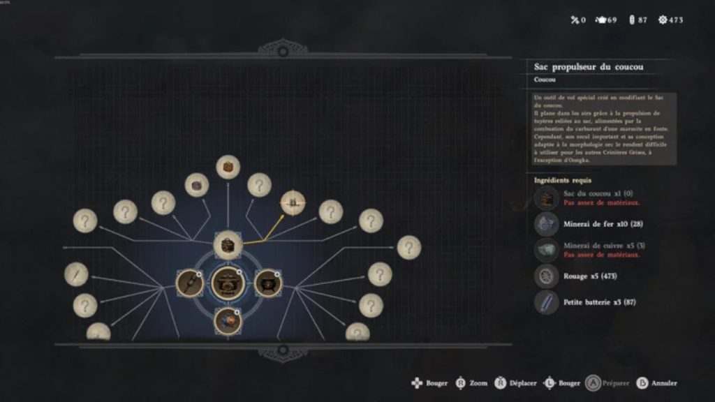 Une fois les matériaux réunis, retour chez Grimnir. Il faudra d’abord assembler les éléments intermédiaires si ce n’est pas déjà fait, puis lancer la fabrication finale du Sac propulseur du coucou.