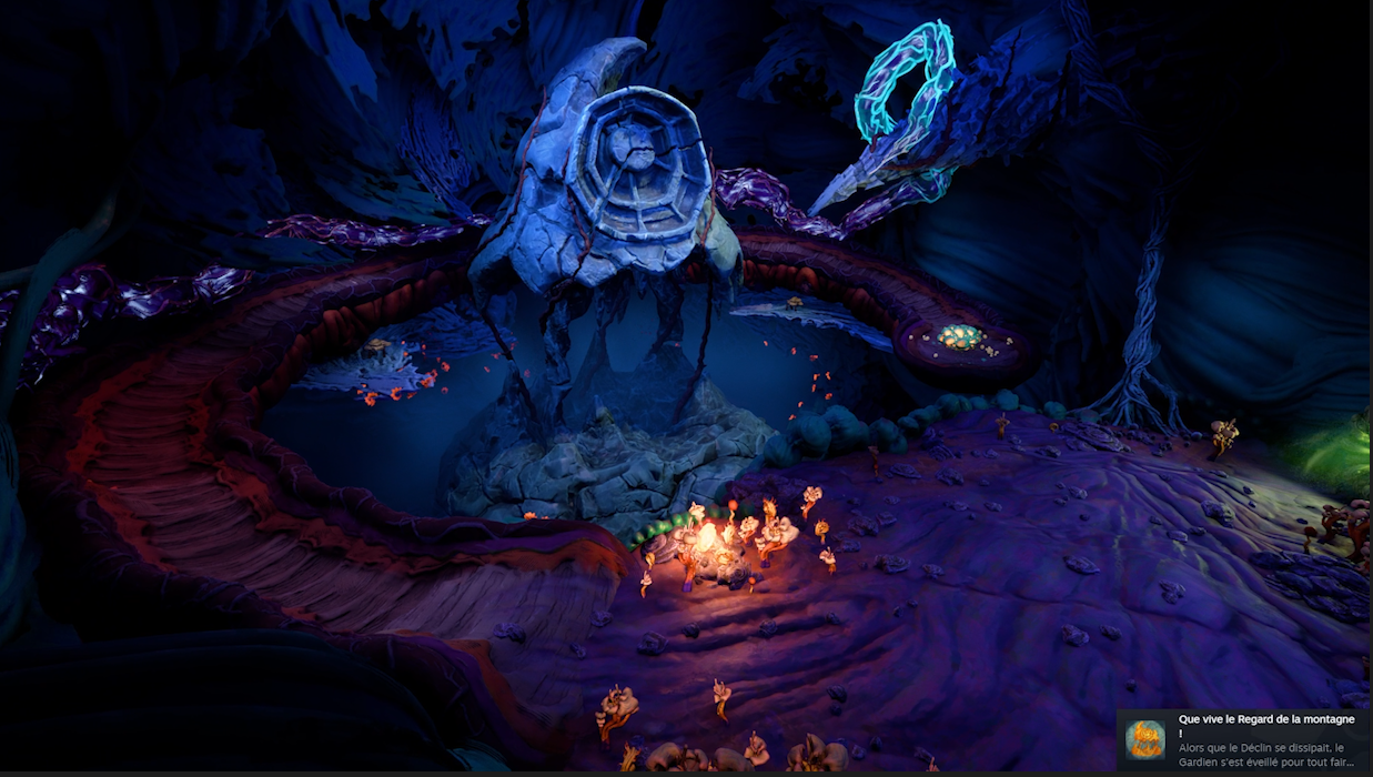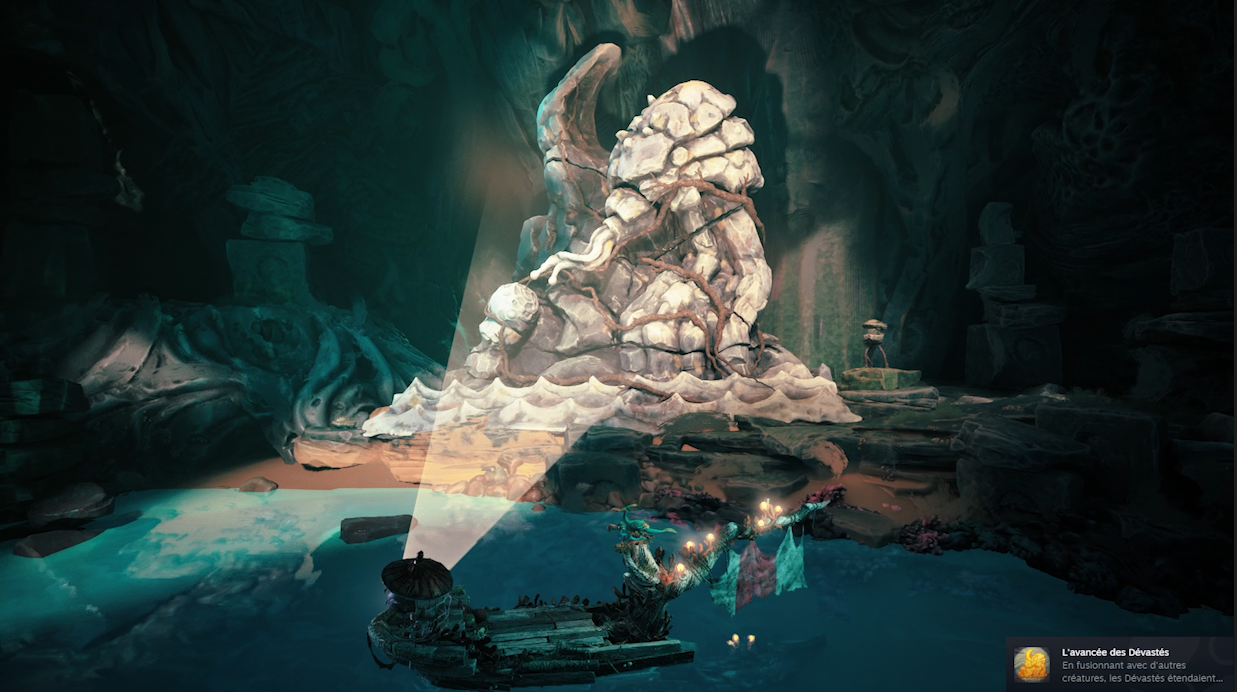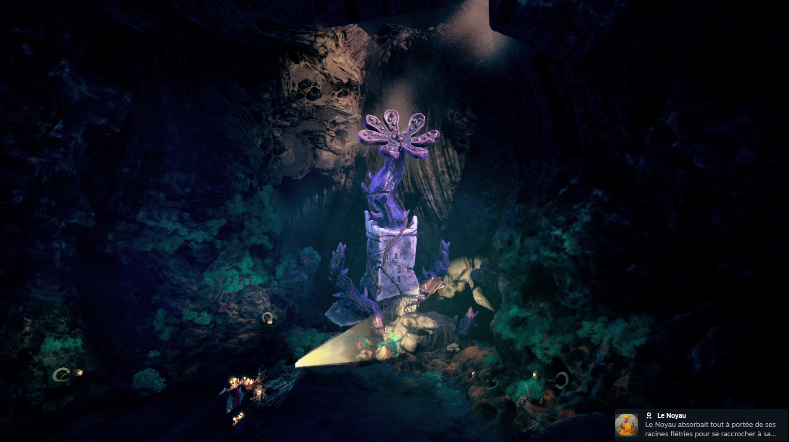 Vers la fin de la zone, en remontant vers la droite juste en face des portes, vous passez près de cascade et voyez vers le fond du décor une zone avec de la corruption au sol. Avant de revenir sur vos pas, allez-y pour déverrouiller l'avant-dernier succès qui se trouve en face. Pour cela, actionnez la germe rouge qui se trouve sur la gauche et débloquez l'animation de la statue. Vous vous rapprochez du 100% BRAVO.