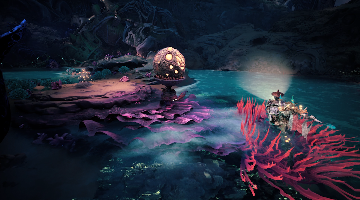 Qu’on serpente le long de côtes escarpées, qu’on chute dans les entrailles d’une caverne sinistre ou que l’on plonge dans une mer de coton rose, l’histoire s’écrit à travers des environnements oniriques portés par une direction artistique stylisée, qui emprunte beaucoup à l’univers de Moebius.